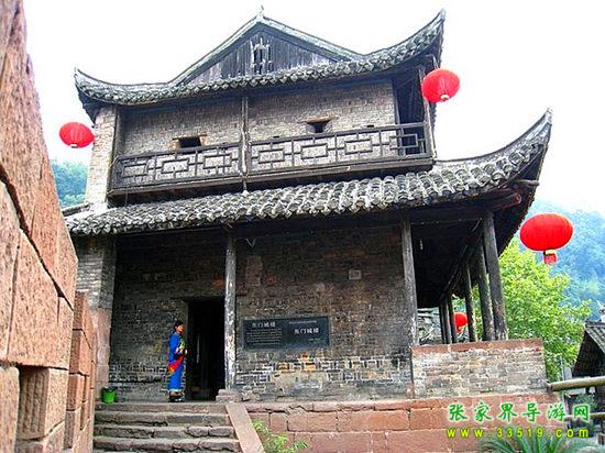 東門城樓始建于清康熙五十四年(1715年),城門下部由紫紅砂巖砌成,上部城樓則用古磚砌筑。城門寬3.5米,高4米,呈半圓拱,兩扇城門都用鐵皮包裹,用圓頭鐵釘密釘,牢實(shí)堅(jiān)固。城墻修筑全部用紅砂條石,精工細(xì)鉆,規(guī)格一致,城墻厚0.8米,下部?jī)?nèi)外兩側(cè)用條石加石灰漿砌成,中間填以碎石粘土,層層夯實(shí);頂部的中間填充物改為石灰、鵝卵石、黃土拌成的三合土,厚約0.33米,上面鋪以紅砂塊石。城樓高11米,大門上方有槍眼8孔。歇山屋頂,覆以腰檐,飛檐翹角,精美壯觀。