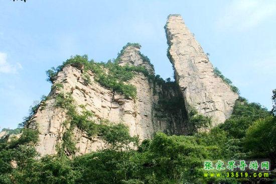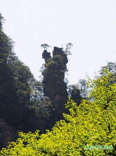 有緣千里來(lái)相會(huì),萬(wàn)水千山總是情。“曾經(jīng)滄海難為水,除卻巫山不是云。”前方這支高300多米的石峰,是不是很像一對(duì)情侶?男的身材高大,頭戴頭盔,身披鎧甲,右手摟著女人的腰,左手撫著女人的肩膀。女的身材豐滿(mǎn),面容清秀,兩眼深情地凝望著自己的愛(ài)人。兩人含情脈脈、情意綿綿的樣子好像有千言萬(wàn)語(yǔ)三天三夜也說(shuō)不完。您猜猜看,他們是在互相傾訴離別的痛苦呢,還是在相互表達(dá)重逢的喜悅?有詩(shī)人這樣寫(xiě)道:“半是愛(ài)憐半是悲,少?gòu)能娢槔戏交?。糟糠啜泣將軍淚,化作春風(fēng)滿(mǎn)谷吹。”相傳這男的是明代抗倭?xí)r一位土家族將軍,一打完仗就千里迢迢,風(fēng)塵仆仆地趕回來(lái)和愛(ài)人相會(huì)。他連頭盔和鎧甲都沒(méi)來(lái)得及換!這女的自從和心愛(ài)的情人離別后,朝思暮想,茶飯不思,“衣帶漸寬終不悔,為伊消得人憔悴”。她清秀的臉上仍顯得有幾分憔悴,卻格外楚楚動(dòng)人!此情此景,您看到了嗎?您看到的是石頭,還是愛(ài)情?山風(fēng)吹在石壁上的聲音和著金鞭溪的流水聲,好像一聲聲祝福:祝您愛(ài)情美滿(mǎn)!愿天下有情人終成眷屬!