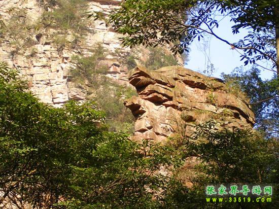 密林中有兩塊石頭,很像兩只龜重疊在一起,探頭探腦的樣子,正向著金鞭溪爬去。有人說(shuō)這是“夫妻雙雙把家還”。這兒有一個(gè)荒誕的故事:億萬(wàn)年前的一個(gè)晚上,海龍王通知居住在這一帶的蝦兵蟹將及所有手下,明天天一亮海水就要消退了,必須全部及時(shí)撤走。這兩只情龜只顧著花前月下,把海龍王的話(huà)當(dāng)耳邊風(fēng),第二天早上起床,望著海水已經(jīng)遠(yuǎn)遠(yuǎn)地退去了,后悔莫及。他們爬呀爬,只希望有一天這溪水能把他們帶回大海。有的人有不同的“版本”:這兩只龜藏在這深山老林干什么呢?為了躲避“計(jì)劃生育”。張家界像烏龜?shù)?hellip;峰很多,那都是它們干的好事呀!