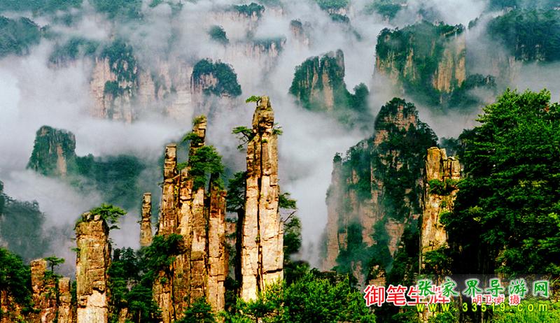 眼前這幾支細(xì)細(xì)瘦瘦的山峰,好像一支一支、一節(jié)一節(jié)地從這個(gè)峽谷中長(zhǎng)出來(lái)的一樣,形狀很像一排倒插在筆筒中的毛筆。筆尖、筆桿可以分得清清楚楚,尤其是頂部一些不大不小的松樹(shù),剛好像是毛筆的筆毫!這簡(jiǎn)直就是出自能工巧匠之手!山長(zhǎng)成這樣子多么不容易啊,它經(jīng)過(guò)億萬(wàn)年流水切割、風(fēng)雨侵蝕、重力崩塌等多種復(fù)雜的地質(zhì)作用才最終形成。除了大自然,誰(shuí)有這樣的匠心和耐心,對(duì)堅(jiān)硬如鐵的石英紗巖進(jìn)行這樣的精雕細(xì)刻?有人說(shuō),張家界如詩(shī)如畫(huà)的風(fēng)景,就是這幾支筆以青山綠水為線條,以風(fēng)花雪月為色彩,以時(shí)間空間為畫(huà)紙畫(huà)出來(lái)的。