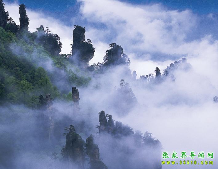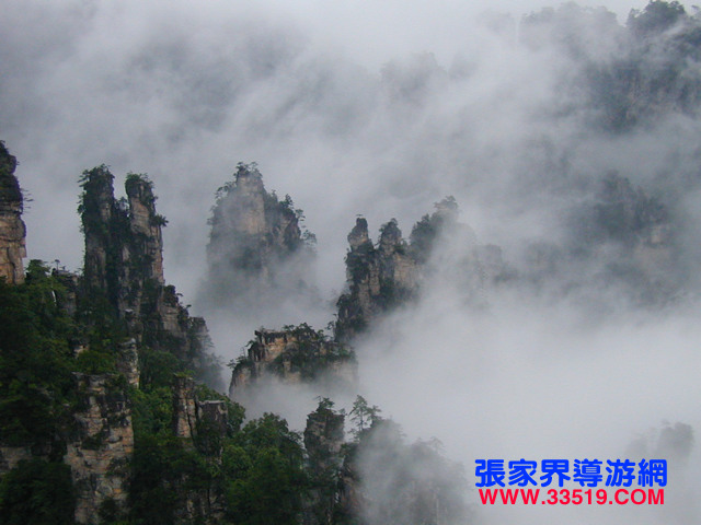天子山還有云霧、月夜、霞日、冬雪四大奇觀。云霧,是天子山最多見(jiàn)的天象奇觀。有云霧、云海、云濤、云瀑和云彩等景象。久雨初晴之后或霏霏 細(xì)雨之中,先是朦朧大霧,繼而形成白云,環(huán)繞飄浮。群峰在無(wú)邊無(wú)際的云海中時(shí)隱時(shí)現(xiàn),使人仿佛置身于蓬萊仙境之中。有時(shí)云霧從溪口涌出,爬過(guò)峰頂, 然后以鋪天蓋地之勢(shì),飛瀉而下,形成云瀑,十分壯觀。月夜,當(dāng)月明星稀,萬(wàn)籟俱寂時(shí),這里的峰林被朦朧月色披上了一層“魔紗”,似一群群魔影聳立在幽谷之中。耳聞禽獸嚦嚦的叫聲,使人產(chǎn)生一種神秘感。霞日,晴天的早晨,一輪紅日在朵朵紅云的襯托下,從奇山異峰中冉冉升起。千萬(wàn)座石塔,婷婷玉立,披上一層紅霞,十分迷人。 冬雪,入冬,天子山銀裝素裹,青松和峰頂被大雪復(fù)蓋。此時(shí)的天子山冰柱倒立,冰花四散,只有一些山鹿 、野豬,才不為銀白世界所征服。