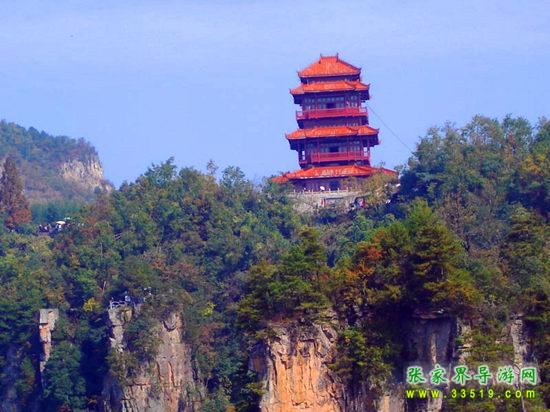 這是六層四重檐穿頭式仿古建筑,高30米,由深圳市政府捐建。建立之初,本打算取名叫“深圳閣”,但遭到許多人(包括深圳人)反對(duì),認(rèn)為這樣與整個(gè)天子山的風(fēng)景不是很協(xié)調(diào)。不過(guò)從另一個(gè)角度來(lái)看,深圳人這種“經(jīng)營(yíng)城市”的意識(shí),卻非常值得張家界人學(xué)習(xí)。“欲窮千里目,更上一層樓”,登樓遠(yuǎn)望,天子山群峰盡收眼底,別有一番風(fēng)景。