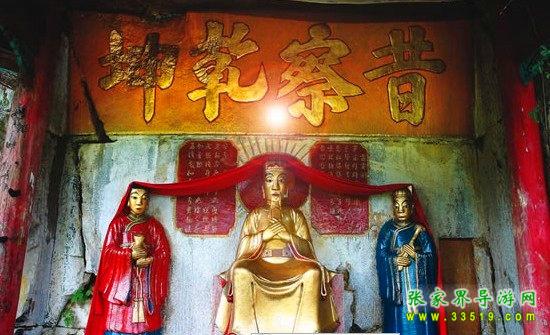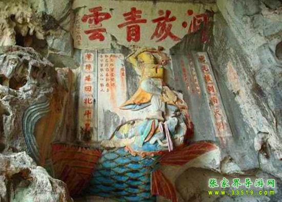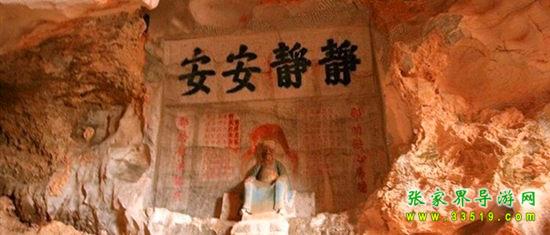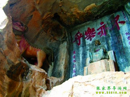 玉皇洞石窟位于張家界城西約7公里的麻空山南壁,為清代本地鄉(xiāng)紳李京開獨資捐修。李京開又叫李五瑞,別名九洞樂,號識破生。他生于乾隆七年(公元1742年),道光乙酉年(1825年)去世,享年83歲。李先生家道殷實,富甲一方。少時勤奮讀書,頗有才華,數(shù)十年奔波仕途,但屢試不第,官場無望,于是看破紅塵,另尋安慰,請工匠,耗巨資,憑借麻空山天然溶洞,按上、中、下方位布局,巧妙構(gòu)思,開鑿成“天堂”、“人間”、“地府”三層共八個洞。另外,在離此約3公里的峰泉洞另鑿一洞,故有“九洞樂”別名。玉皇洞石窟上層為玉皇洞,人間層有玉金洞、毫筆洞、墨池洞、虎龍洞、雄獅洞、孔圣洞,地府為因果洞,八洞組成一個完整的混沌世界。居八洞之首的玉皇洞,雕有玉皇大帝神像,意為“天堂”至尊,統(tǒng)帥中層的“人間”和下層的“地府”,故八洞統(tǒng)稱玉皇洞。此洞于1799年動工,到1807年完成,歷時八年。洞內(nèi)雕鑿了一些歷史人物的神像以及大量詩詞匾對,不僅石雕精湛獨特,雕像神韻生動,書法遒勁大氣,而且在石窟藝術(shù)的主題構(gòu)思上,抒發(fā)了主持捐修者李京開懷才不遇、憤世疾俗、向往太平盛世的情感,鞭達(dá)了腐朽的科舉制度,對于研究清代社會和科舉制度,以及當(dāng)時一般讀書人的思想情感,都具有一定的史料價值。整座洞窟東西長300余米,現(xiàn)存石像19尊,石刻50多處,是湖南省唯一保存完好的石窟藝術(shù)群,1959年玉皇洞被列入湖南省重點文物保護(hù)單位。