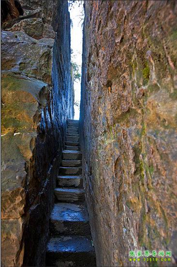 要繼續(xù)前進的路,悄然間已不那么分明,鉆洞繞石,似路非路,幾米外便難見人,百余米的路,艱難曲折,人需要彎腰才能上行。第二道鬼門關“誰能不低頭”便擋道于此。近百米的陡坡幾近直立,石路從兩塊巨石間穿過,人須側身才能慢慢上行,一夫當關,萬夫莫開。“一夫關”是第三道鬼門關。烏龍寨能立足多年,并非徒有虛名。