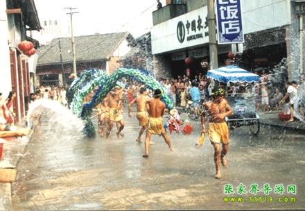 張家界潑水龍又叫“澆水龍”,于唐朝時期由移居本地的白族興起演變而成,在永定區(qū)的尹家溪鎮(zhèn)西尹村、莫家崗村十分盛行,是當?shù)?a class="insidelink" href="http://www.szfeiya.com/fengqing/" title="土家族">土家族,白族、苗族在天熱干旱時節(jié)求雨祈福的一種形式。一旦出現(xiàn)旱災,當?shù)仡^面人物就會出來組織潑水龍,演出極其隆重。