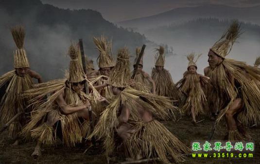 茅古斯雖然還不是成熟的戲劇形式,但已有模擬遠古先民勞動和生活的故事情節(jié),并通過舞蹈、道白來表達內容。通常由15人表演。表演者頭戴尖頂齊脖茅草帽,頭扎草辮,全身皆用稻草包扎,象征全身都長著毛的先民。演出時,有簡單布景,由一人領舞出場,茅古斯數(shù)人尾隨歡跳,抖動全身稻草,搖晃頭上草辮,以變嗓對話歌唱。表演內容有刀耕火種、圍獵、捕魚、接新娘、先生教書、甩火把等。茅古斯表演從形式到內容,都別具一格。演出自始至終講土話、唱土歌,但以對白為主體,觀眾也可答話插白。演員或歌或舞,或蹦蹦跳跳、翻跟斗、做游戲?;蛩椴竭M退,曲膝抖身,左跳右擺,搖頭聳肩,全都是模仿古人粗獷的憨態(tài)。形態(tài)滑稽,詼諧有趣。