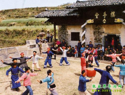 “擺手”,土家語稱為“舍巴”。原為“男女齊集歌舞,祓除不祥”的帶有原始宗教性質的集體舞蹈。過去多在農歷正月初六至十五日晚餐之后舉行。屆時,人們聚集擺手堂前,先舉行祭祀儀式,然后敲鑼打鼓,鳴放鞭炮,眾人圍圈而舞,盡情歡跳。具體方式,人數(shù)不限。由一人在圈中司鼓鳴鑼,男女舞眾圍成圓圈,隨鼓點進退,變換舞姿。一般手與腳成順向同時動作,兩人一組,面面相對,踢踏擺手,翩躚進退,扭腰旋轉,矯健有力。套式和內容多種多樣。每舞一周或數(shù)周換一套程式,表現(xiàn)征戰(zhàn)、狩獵、勞動和日常生活等不同內容。