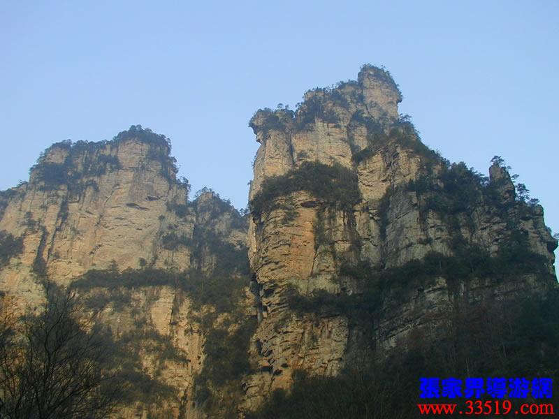 (金鞭巖、神鷹護鞭)如果要問張家界國家森林公園的標志景點,答案是現(xiàn)成的:金鞭巖。早在清代中期,一些文人就把張家界的峰林及百丈峽列入“永定八景”。其一叫“危峽啼猿”;其二叫“層巖涌塔”:“縣西二十里青崖山,其前五山并立,層峙如浮圖。中一峰更峻拔,上插宵漢,晴輝雪積,最擅奇觀。”這里說的“其中一峰”,指的金鞭巖。八大景點張家界占其二,可見先人是有眼力的。金鞭巖相對高度380多米,拔地而起,直插云霄,無論你遠看近看,正看側(cè)看,都是一根刺破青天的長鞭!在金鞭巖左側(cè)的那座巖峰,大家看多像一只兇猛的老鷹,勾嘴瞪眼,雙翅略展,時刻警覺地守護著金鞭,人稱“神鷹護鞭”。