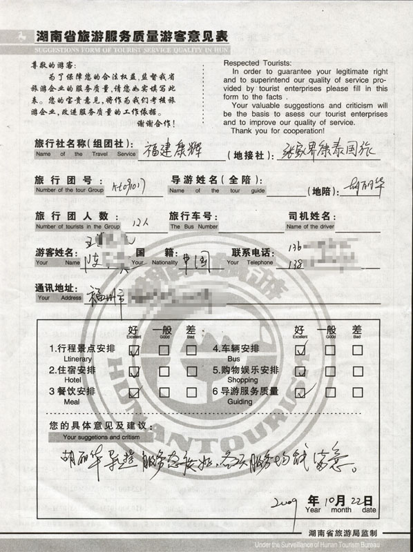 2009年10月17日福州王先生一行12人接待質(zhì)量反饋單:
