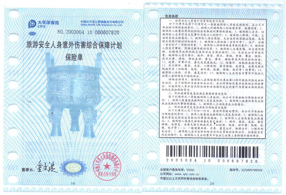 1、旅行社責(zé)任險(xiǎn);(從游客上了我社的安排的接待交通工具時(shí)到離開我們安排的接待交通工具時(shí)為止,不含客人來回湖南張家界地區(qū)的火車和飛機(jī)上的時(shí)間段);