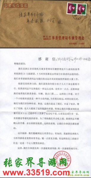 浙江省省級(jí)機(jī)關(guān)事務(wù)管理局車輛管理處致張家界康泰國旅導(dǎo)游黃濤感謝信