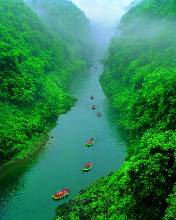 7點(diǎn)準(zhǔn)時(shí)等在萊頓大酒店門口,猛洞河漂流180元/人,漂流的車一般會(huì)來接參加漂流的客人的,上了車已經(jīng)有好幾位游客,然后車子又去接了幾位,7:30人接齊,離開張家界去猛洞河,車程約1個(gè)半個(gè)小時(shí),漂流約2個(gè)半小時(shí)。在萊頓大酒店的那個(gè)晚上張家界半夜打雷下雨,我們想今天水很大,漂流會(huì)很刺激。到了那邊才知道上游建了水壩調(diào)節(jié)水量搞平均主義,所以漂流的驚險(xiǎn)度一般般了,后來去鳳凰公路上比較顛簸,我戲稱可以將車當(dāng)船補(bǔ)足漂流的感覺,呵呵。不過瀑布因此壯觀不少,漂流沿途至少見到有七八條瀑布,非常漂亮。