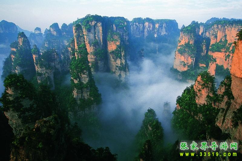 第二天早上,我們參觀了袁家界的風(fēng)景,其中最有名的當(dāng)然數(shù)天下第一橋,這是由兩座巖石山的山頂自然生長在一起,非人所能為也。天下第一橋的稱號當(dāng)之無愧啊。當(dāng)然在袁家界,后花園也是不能不看的。張家界號稱“峰三千,水八百”,在這里你就能明顯的感覺到這句話的前半句是那么的實(shí)在。看完張家界的核心袁家界,我們乘車到了天子山(張家界景區(qū)內(nèi)的最高的地方)。玩了賀龍公園、御筆峰、仙女散花、西海、石船出海、仙人橋、天子廟、十里畫廊、一步難行。不巧的是,那天山上下了一點(diǎn)陣雨,雨后一條彩虹掛在天上,更重要的是山上起了一點(diǎn)霧,使整座山都籠罩在霧中,若隱若現(xiàn),看上去就象是在云海中,好象老天特地配合我們似的,難得一見的西海等正好被我們趕上了。江導(dǎo)告訴我們,這樣的機(jī)會是很難得的,可能是張家界為了感謝我的再次到來,給了我一個特別的禮物吧。我大笑。晚上趕到昨天住的地方去住宿。不提。